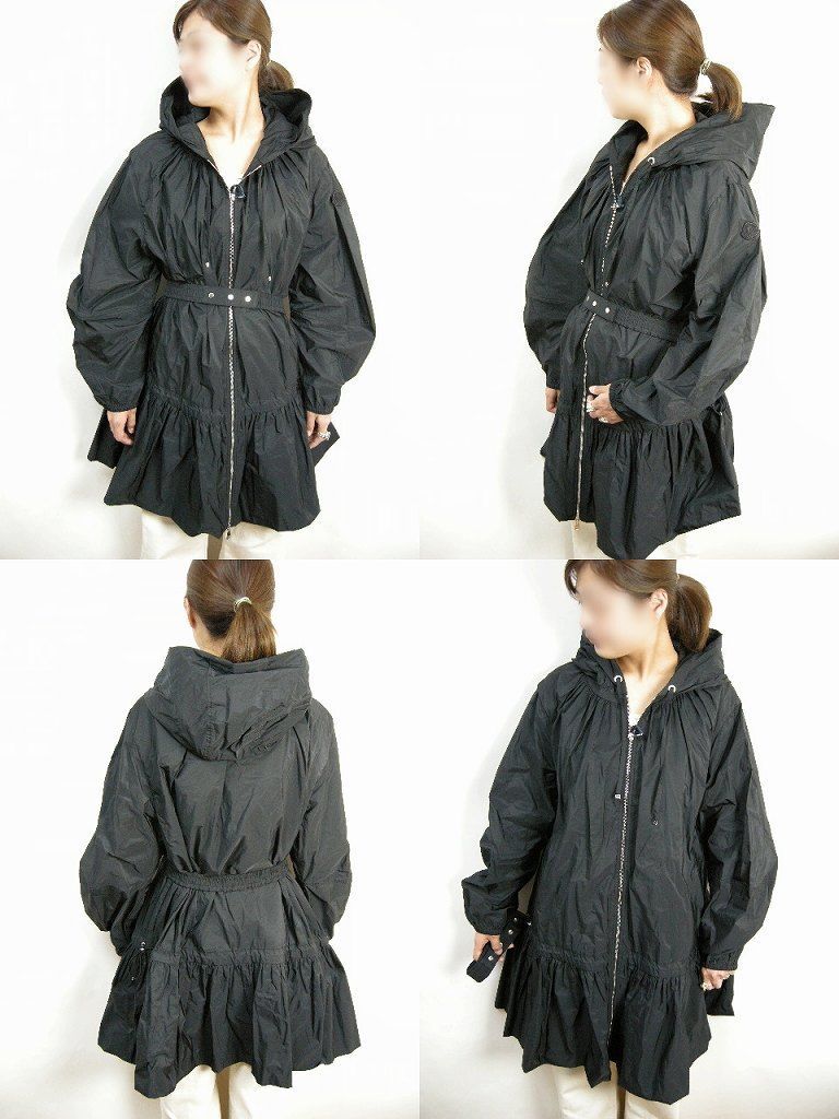 サイズ2 モンクレール BERNIERES ベルト付きフリル ナイロンコート ブラック レディース
